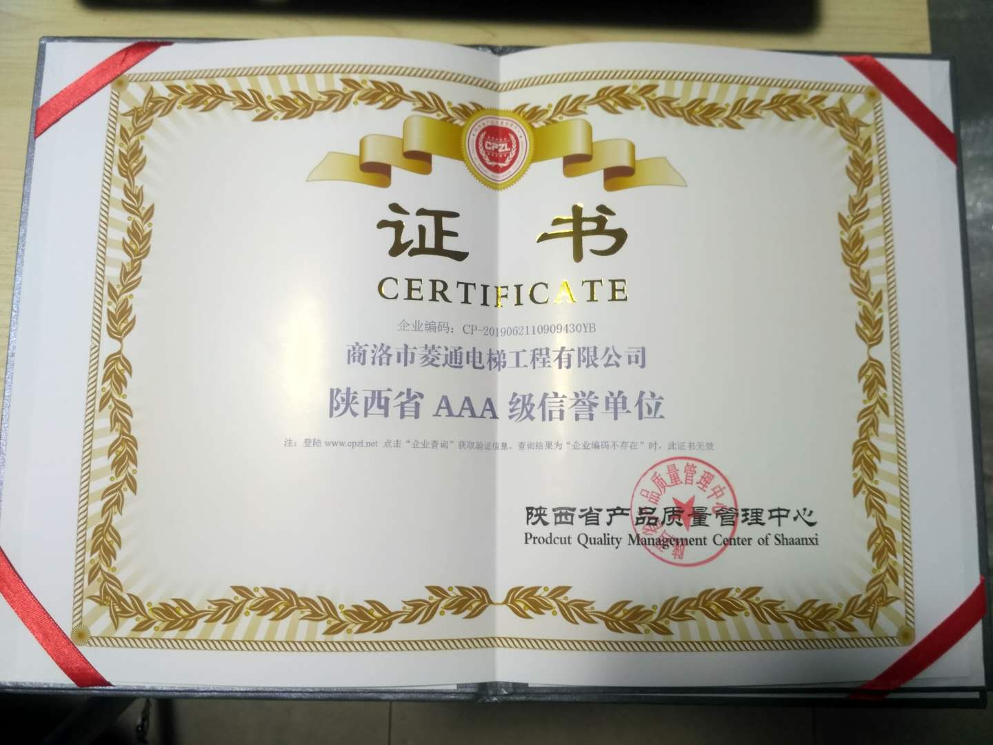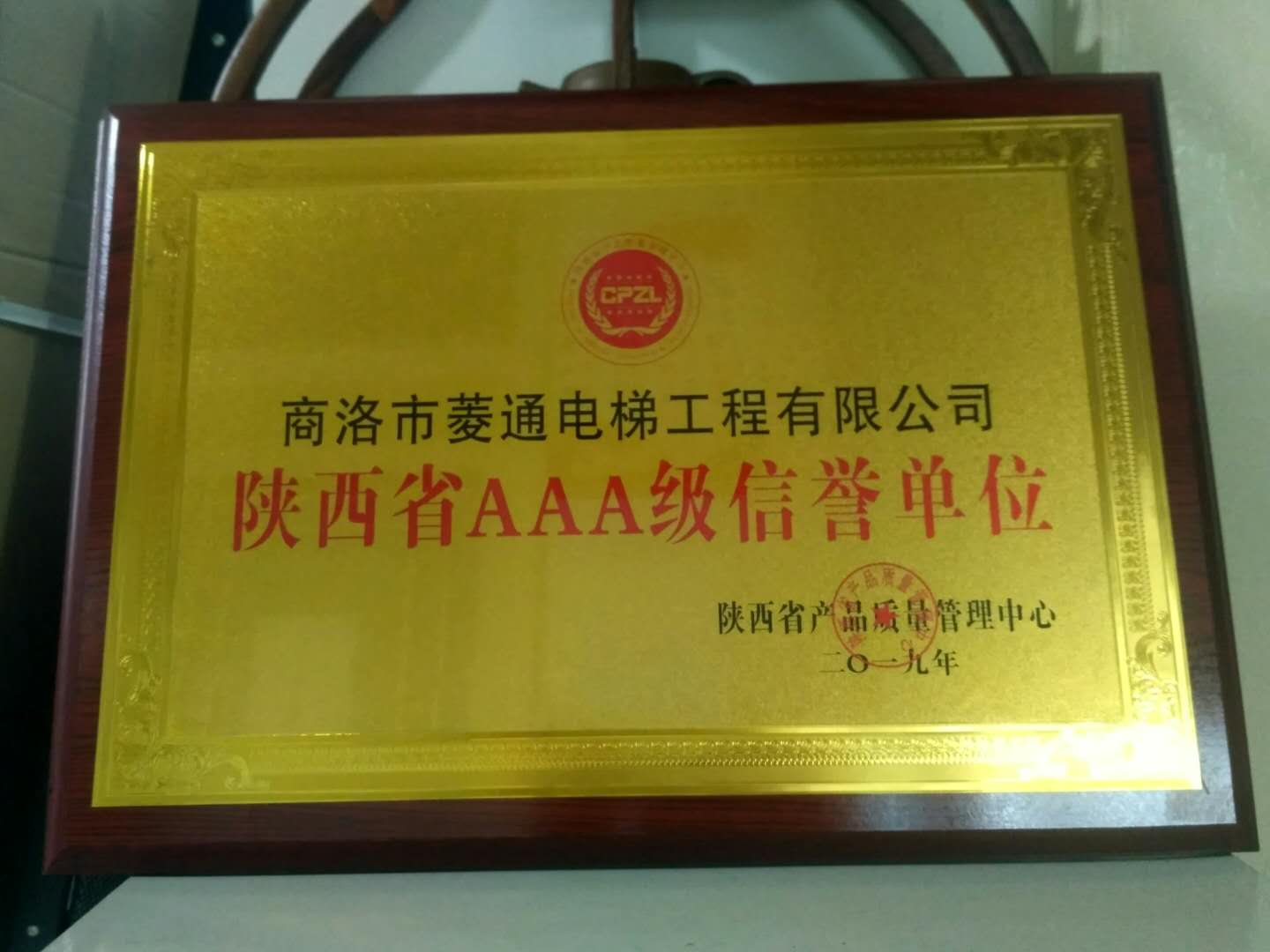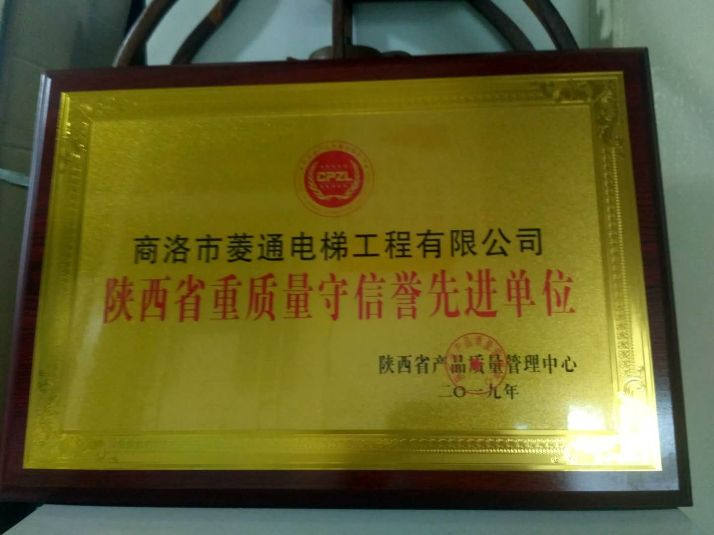 商洛菱通電梯工程有限公司,2019年很榮幸被陜西省產(chǎn)品質(zhì)量管理中心評為:陜西省AAA級信譽單位和陜西省重質(zhì)量守信譽先進單位;并頒發(fā)獎牌及榮譽證書。這個榮譽不但得益于各單位的支持與默契合作,更得益于我公司優(yōu)良的團隊氛圍和集體上下一致積極認真的工作態(tài)度。更得益于領導重承諾守信譽:提倡安全第一,質(zhì)量第一,信譽第一的原則。能被評為3A級信譽單位和信譽先進單位,既是對公司工作的肯定,也是對今后工作做得更好的一種鼓勵,我公司定會盡職盡責做得更好。